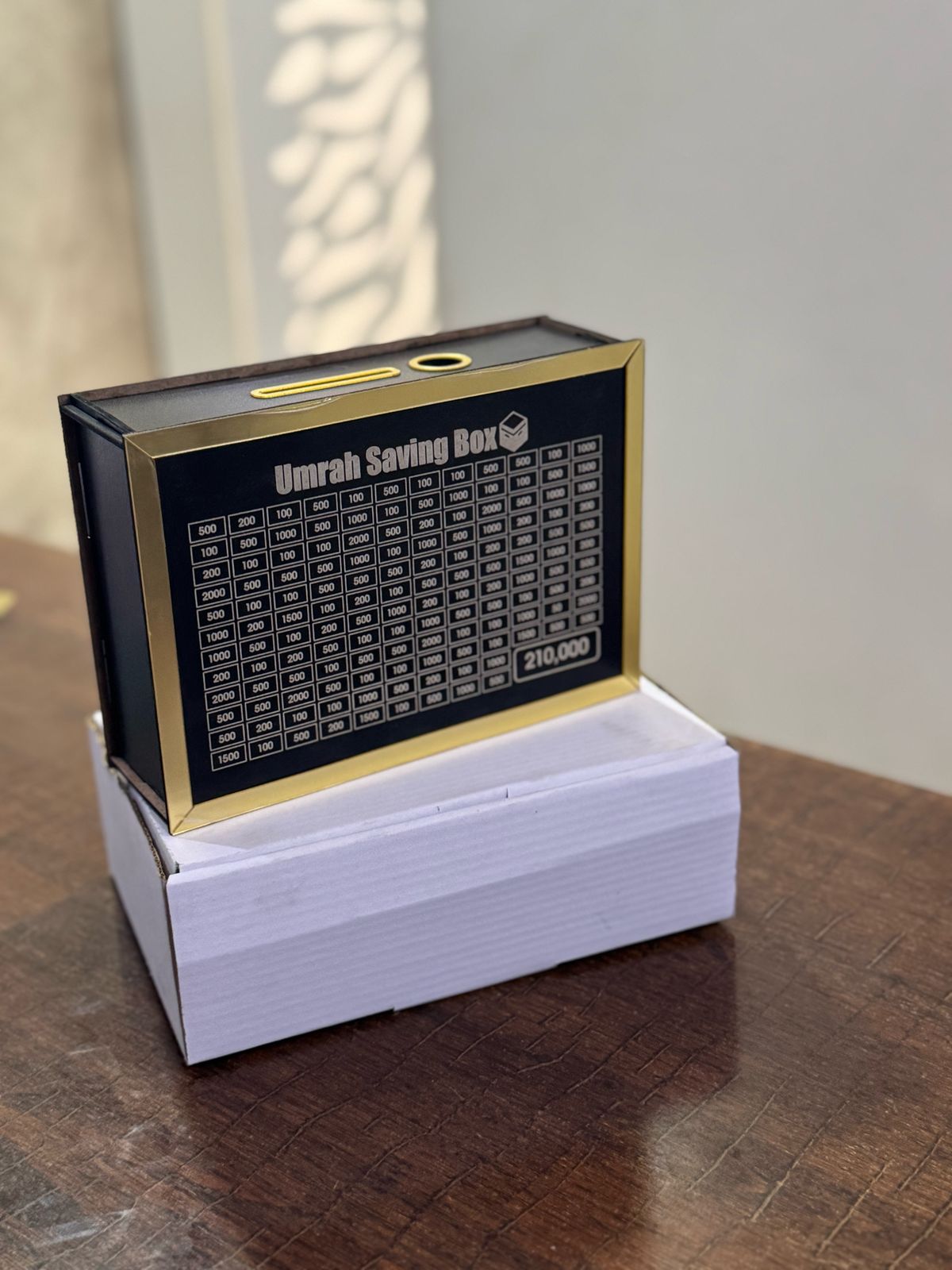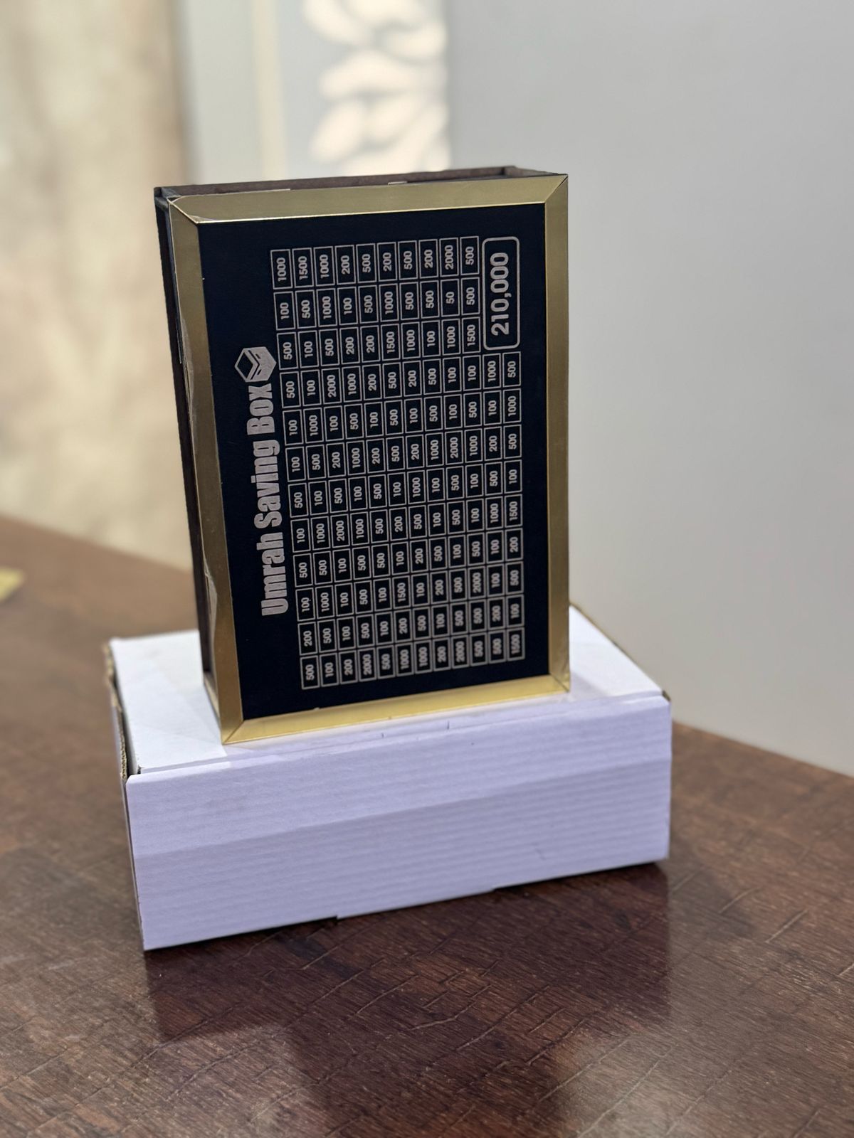 The 100K Money Saving Box is a practical and elegant way to save money. Made from high-quality wood, it features a structured design that allows you to save up to 100,000 in small increments of 200, 400, and 1000. With more slots and higher denominations, it’s ideal for those who want to reach their savings goals faster.